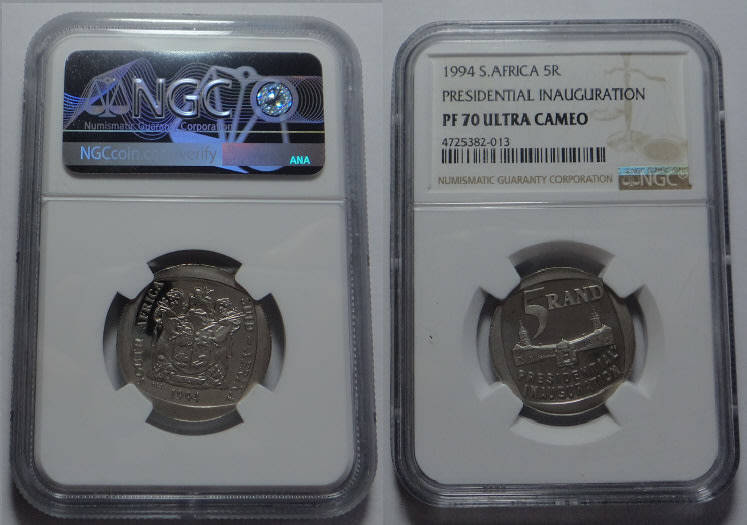 Republic of South Africa: Inauguration R5 of 1994: NGC graded PF70 Ultra Cameo