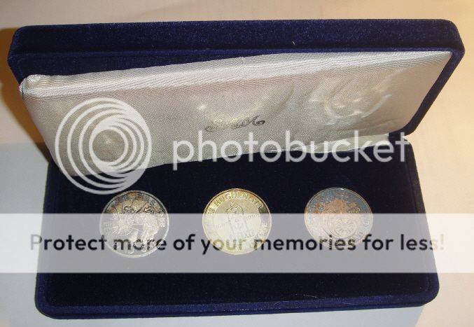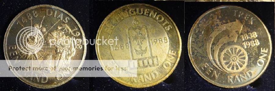 The proof-set consists of the three commemorative silver R1 coins of 1988 being the Bartholomew Diaz (1488-1988), The French Huguenots (1688-1988) and the Great Trek (1838-1988).