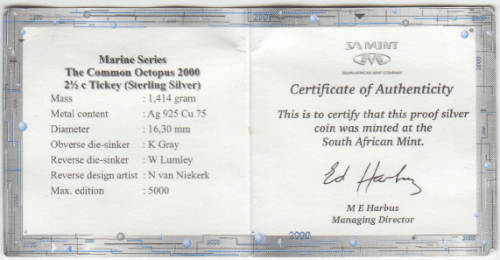 Republic of South Africa: Proof Tickey (Silver 2.5c) of 2000 (Octopus)