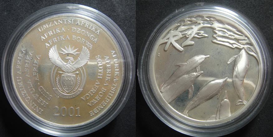 Republic of South Africa: Silver Proof R2 Crown of 2001 (Dolphins)