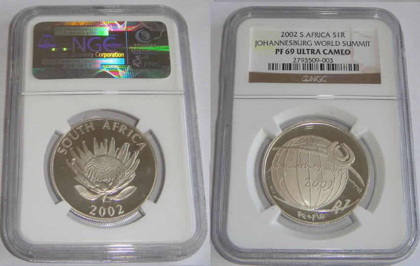 Republic of South Africa : Silver R1 of 2002 (JHB World Summit): NGC graded PF 69 Ultra Cameo