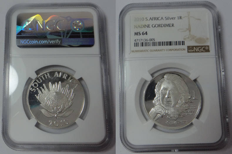 Republic of South Africa: Silver R1 Protea 2010 (Nadine Gordimer): NGC graded MS 64