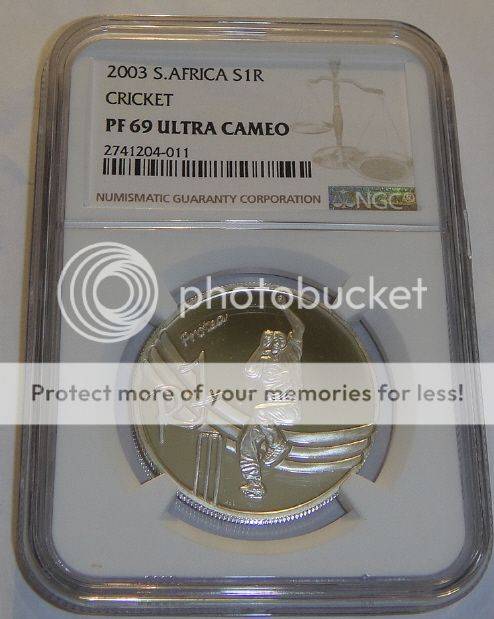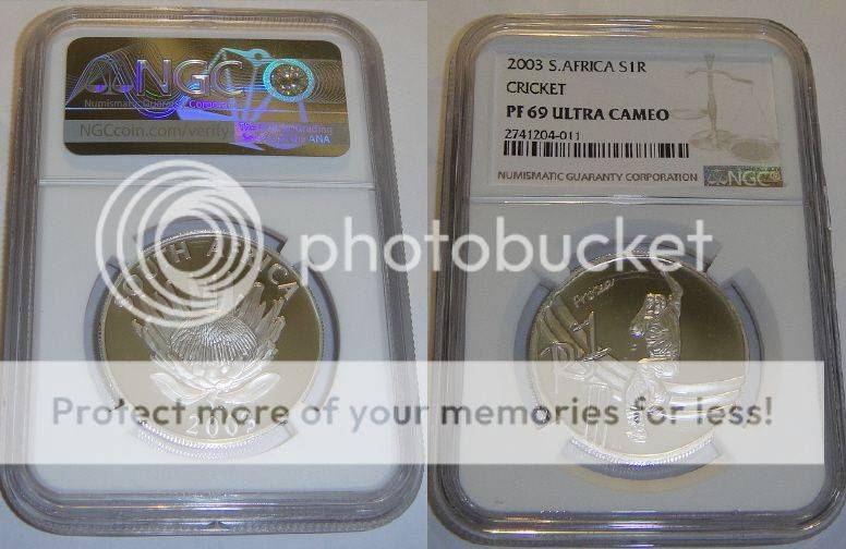 Republic of South Africa : Silver R1 Protea of 2003 (Cricket) : NGC graded PF69 Ultra Cameo