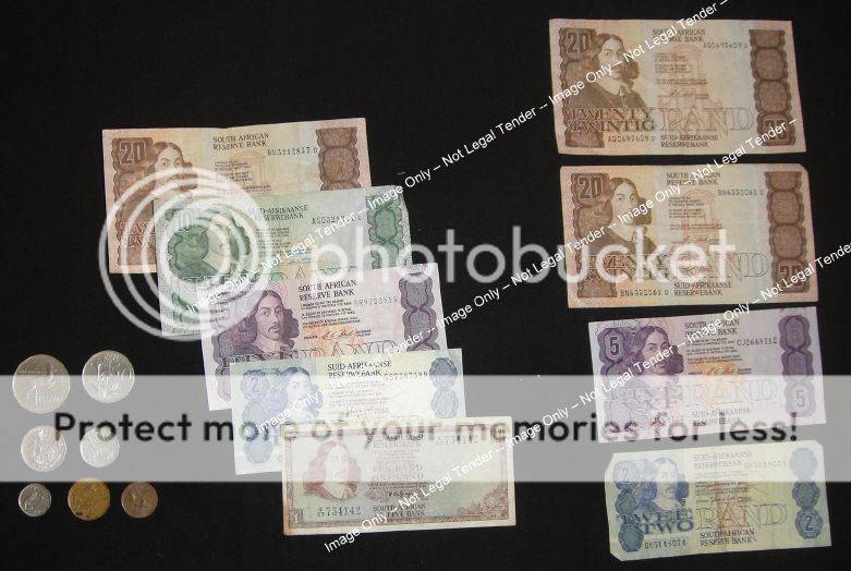There is a type set of coins from our second decimal series (1c, 2c, 5c, 10c, 20c, 50c and R1) and a bank note set of Jan van Riebeeck (R1, R2, R5, R10 and R20) and a further R2 (tear), R5 and 2 x R20 notes.