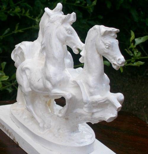 RESIN PAINTED OVER WITH WHITE ENAMEL PAINT ON A WOODEN BASE. PLEASE NOTE THAT THE ONE HORSE'S LEG IS NOT COMPLETE. MEASURES 22 CM HIGH BY 29 CM LONG.