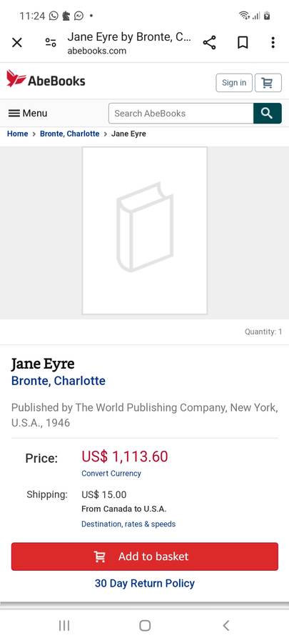 RETAIL $1,113.60 - R20 600.00 - JANE EYRE - BY CHARLOTTE BRONTE - RAINBOW CLASSICS - 1946