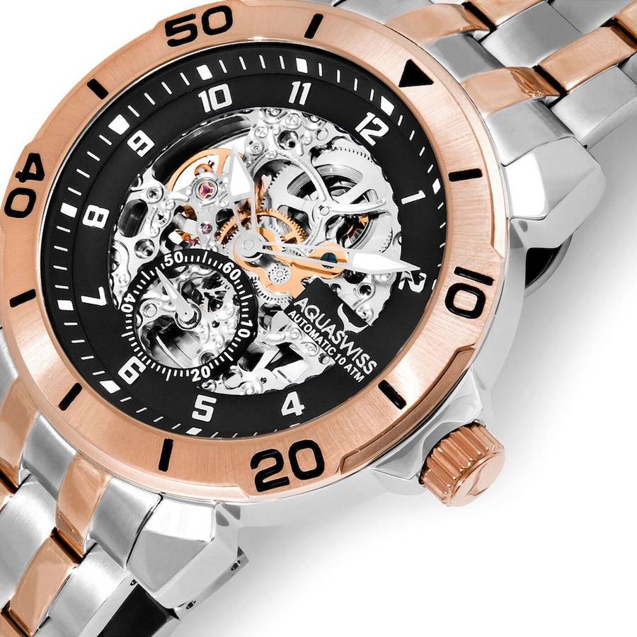 Feast your eyes on this quality Swiss made timepiece from Aquaswiss! Get a glimpse at the intricate mechanical workings through the skeletonized dial, which features a small seconds subdial located at 6:00. Available with a two-tone stainless steel bracelet and bezel in either gold-tone or rose-tone. A 10 ATM water resistance rating ensures you can stay on top - rain or shine.