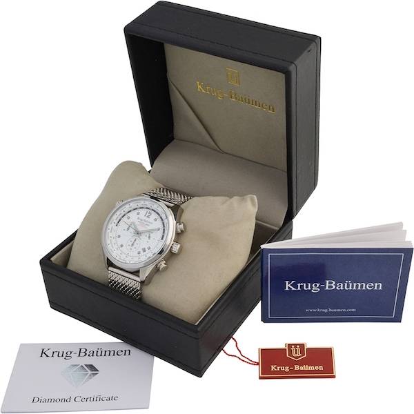 This distinguished watch features 8 single cut clear diamonds mounted upon the easy to read dial which rests on the Japanese precise chronograph movement with the 3 sub dials. The bi-directional heightened bezel features a tachymeter that calculates time/distance for those budding pilots. This classic timepiece features a large 44mm case made from solid stainless steel and comes with a matching genuine leather strap. The functions of the chronograph and date are set via the middle decorative crown on the side of the case and the two matching pushers either side.