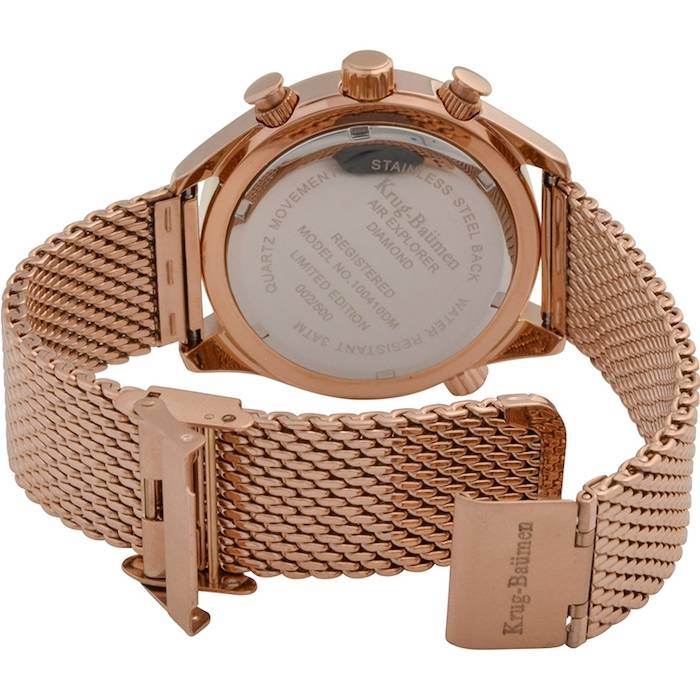 This distinguished watch features 8 single cut clear diamonds mounted upon the easy to read dial which rests on the Japanese precise chronograph movement with the 3 sub dials. The bi-directional heightened bezel features a tachymeter that calculates time/distance for those budding pilots. This classic timepiece features a large 44mm case made from solid stainless steel and comes with a matching milanese steel strap. The functions of the chronograph and date are set via the middle decorative crown on the side of the case and the two matching pushers either side.