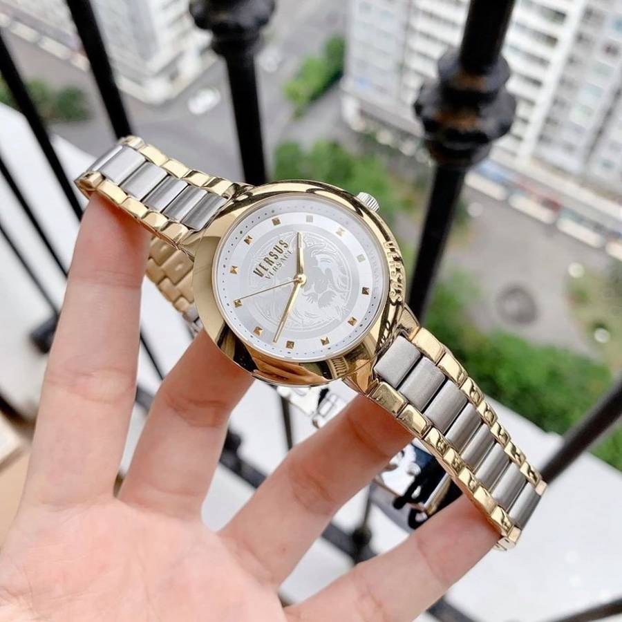 Features a two tone gold tone stainless steel case. White gold tone dial with three hand movement and the lion head motif etched on on the dial face.