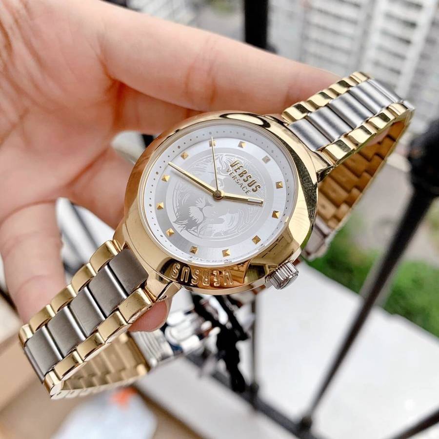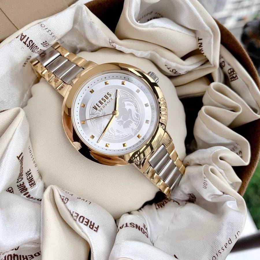 Features a two tone gold tone stainless steel case. White gold tone dial with three hand movement and the lion head motif etched on on the dial face.