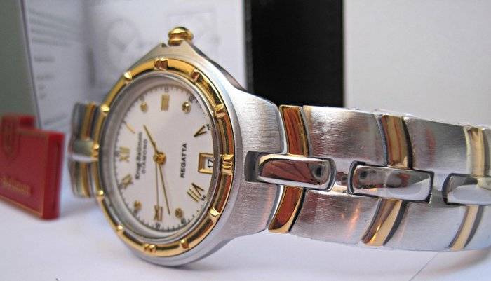 The bracelet and watch head have IPG (gold)to complement the brushed steel look. The time and fast date function are adjusted with the crown, which itself is finished with a real onyx tip. Every Regatta is carefully engraved with it's own unique serial number and preseted in it's own display case. IT IS A LUXURY BRAND.