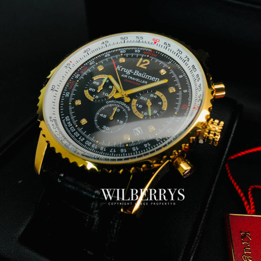 Gentlemen's Sports Split Time Chronograph with Tachymeter function and Slide Rule. Pilots can use the slide rule to get estimates of important information such as flight time and fuel consumption. Features 8 single cut diamonds & 3 eye chronograph display. The stainless steel head is finished with polished Silver or IPG (Gold) plate for a stunning look. Genuine leather strap with personalised IPG plated buckle. Every Air Traveller is carefully engraved with it's own unique serial number and presented in it's own display case. A diamond authenticity certificate is provided for complete peace of mind. Case diameter 46mm. Water resistance 30m/suitable for light splashes only (avoid water).