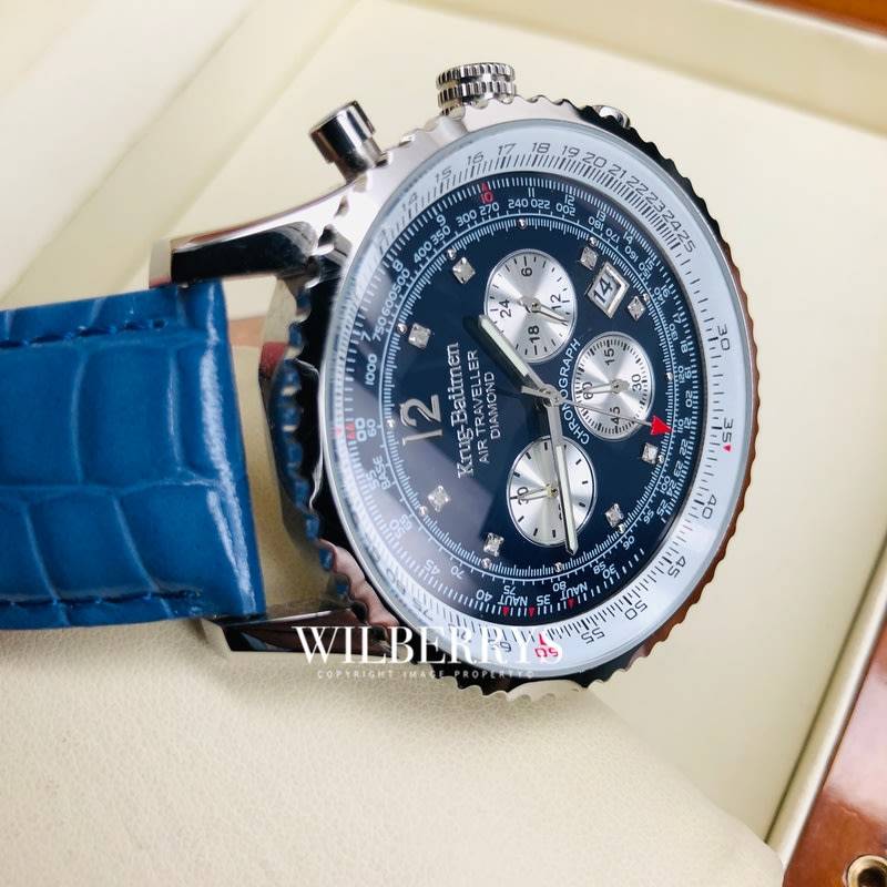 Gentlemen's Sports Split Time Chronograph with Tachymeter function and Slide Rule. Pilots can use the slide rule to get estimates of important information such as flight time and fuel consumption. Features 8 single cut diamonds & 3 eye chronograph display. The stainless steel head is finished with polished Silver for a stunning look. Genuine leather strap with personalised buckle. Every Air Traveller is carefully engraved with it's own unique serial number and presented in it's own display case. A diamond authenticity certificate is provided for complete peace of mind. Case diameter 46mm. Water resistance 30m/suitable for light splashes only (avoid all water).