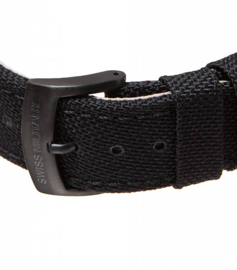 Swiss Made® quartz Chronograph movement *Ronda Cal. 5030 13 Jewels *Black PVD Stainless steel case *Screw down winding crown Sapphire crystal *Canvas strap (width 22mm, length 190mm) *Water resistant 20ATM *Case 44mm *Luminous hands for night vision