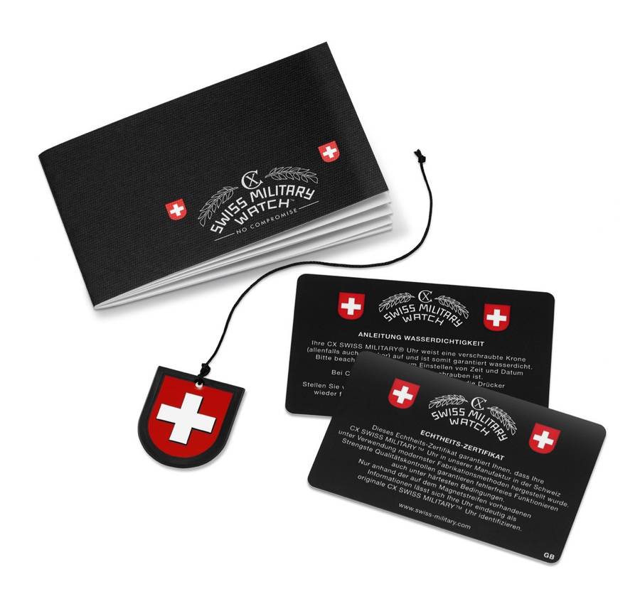 Comes packed in Swiss Military traditional wooden gift box with instruction pamphlet, certificate of authenticity, water resistance certificate