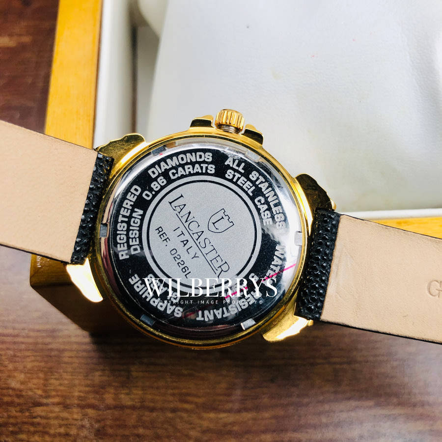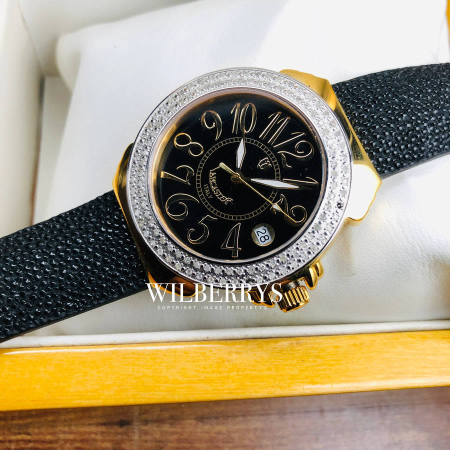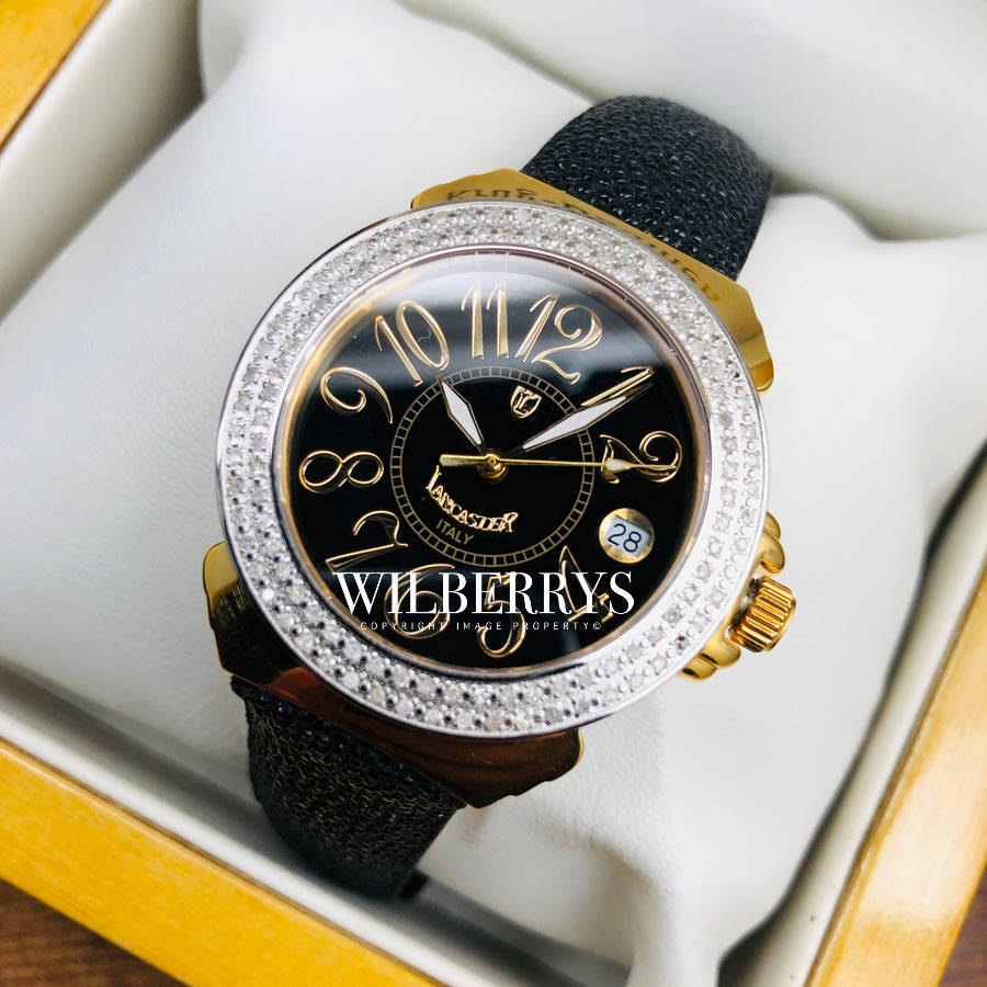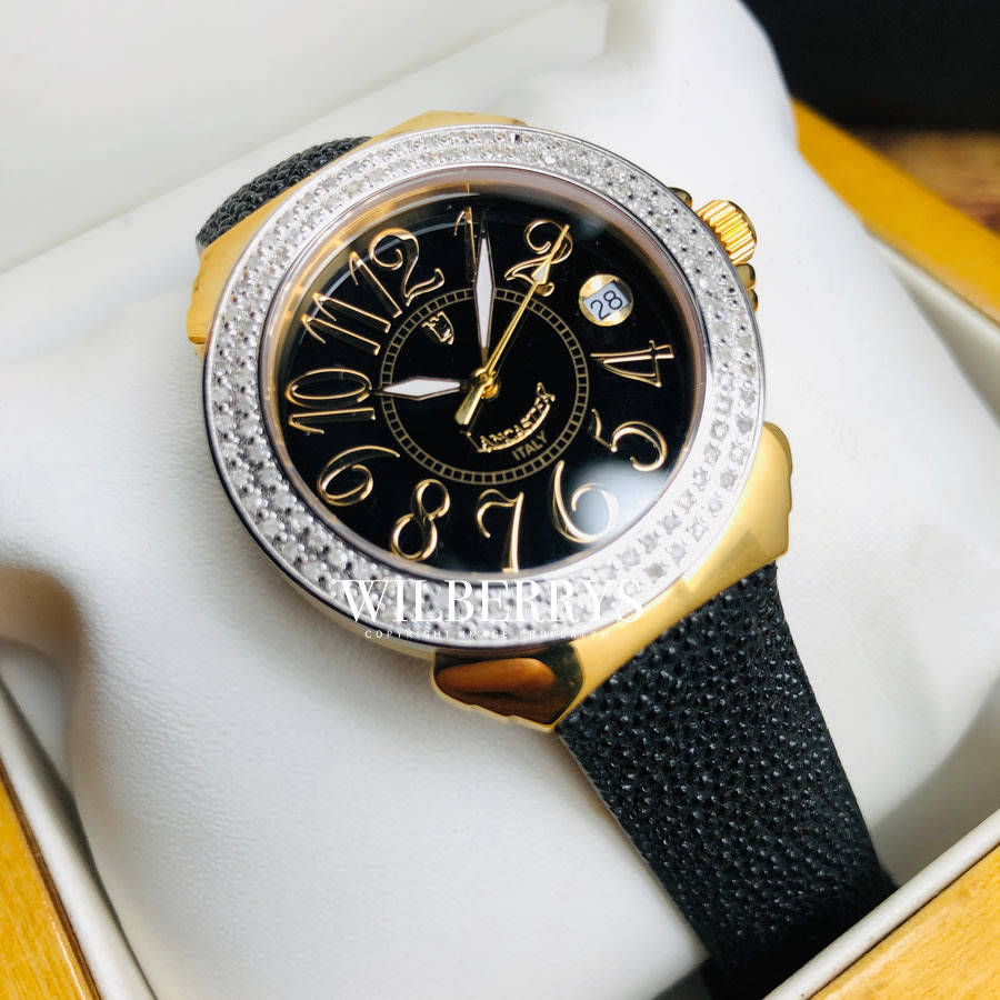 An exquisite 18k gold plated bezel with 112 sparkling diamonds (0.86 ct) accentuates the elegant mother of pearl face of the Pillola watch. Large stylized numbers in matching rose gold are easy to read and a Japanese quartz movement keeps perfect time. Signature box included. Swiss Made.