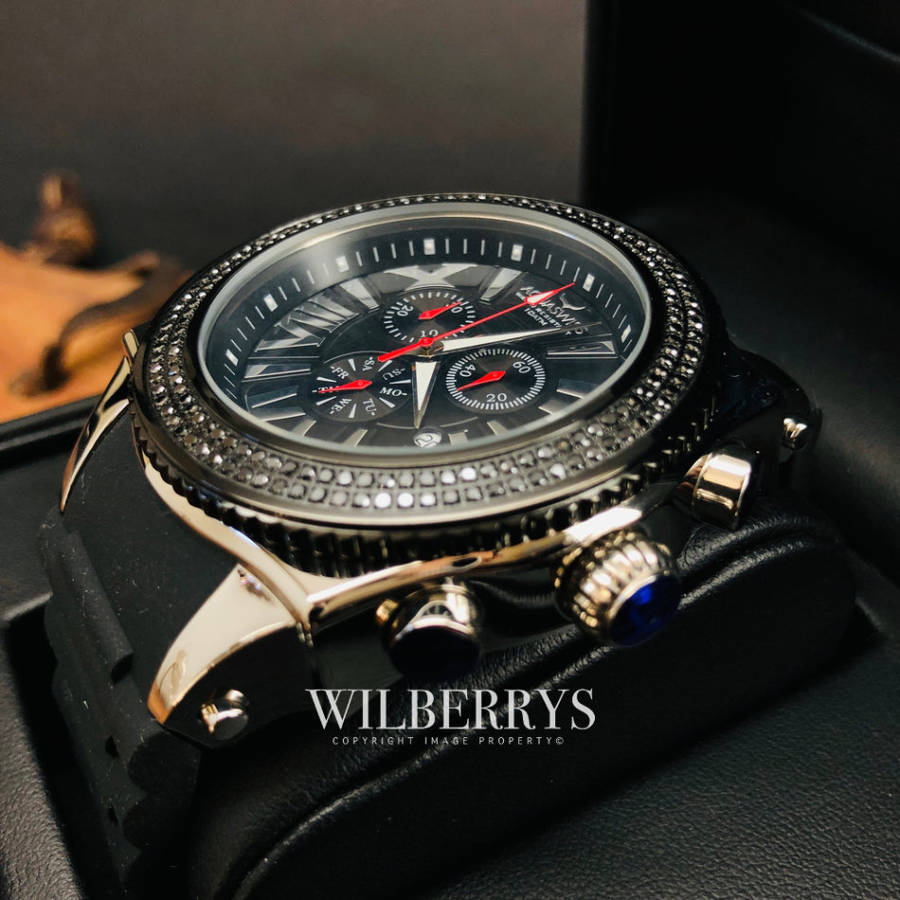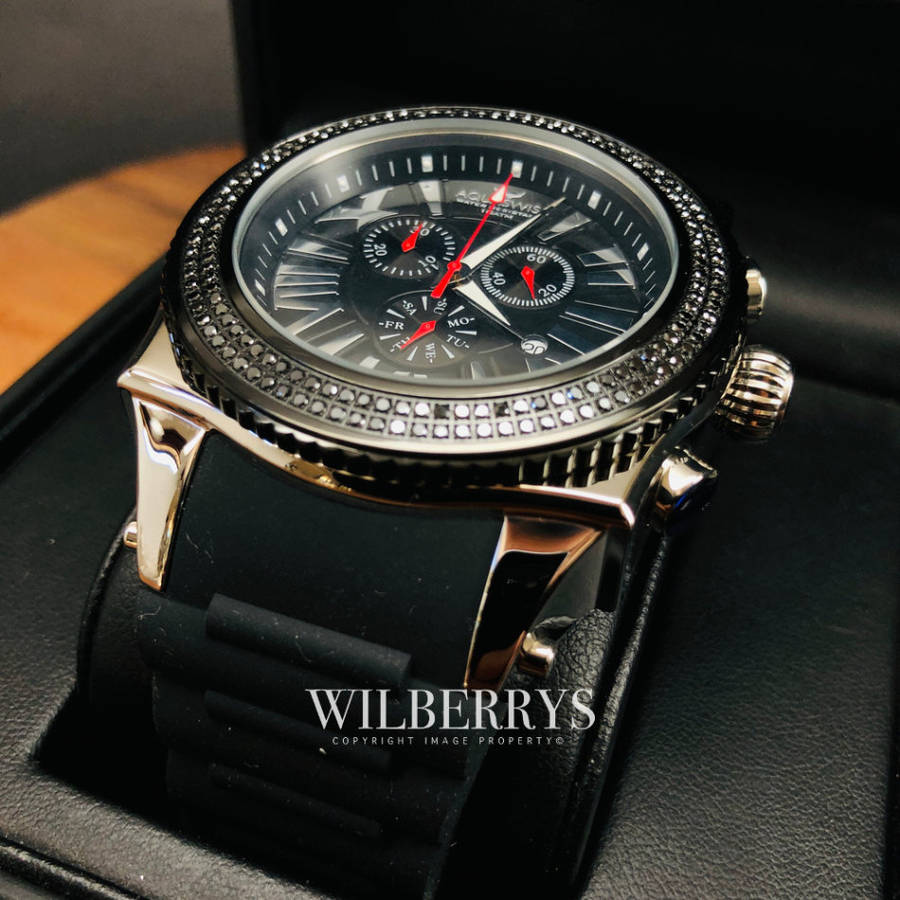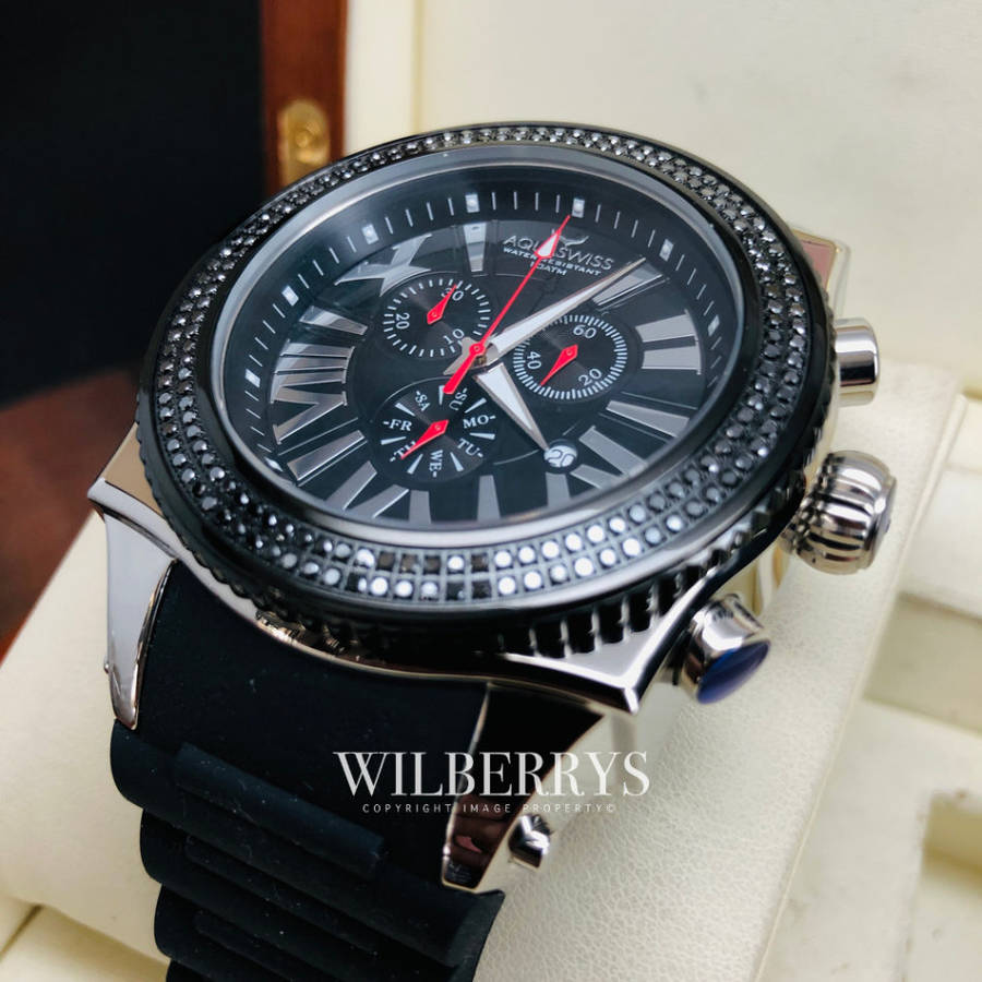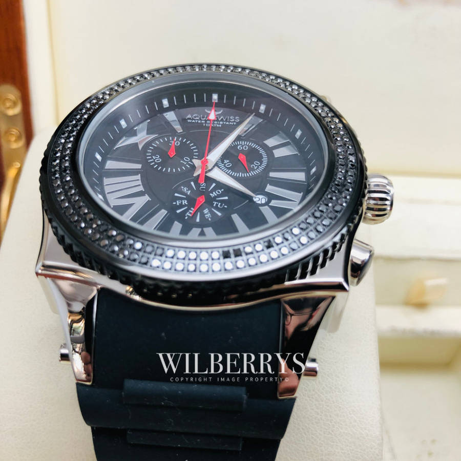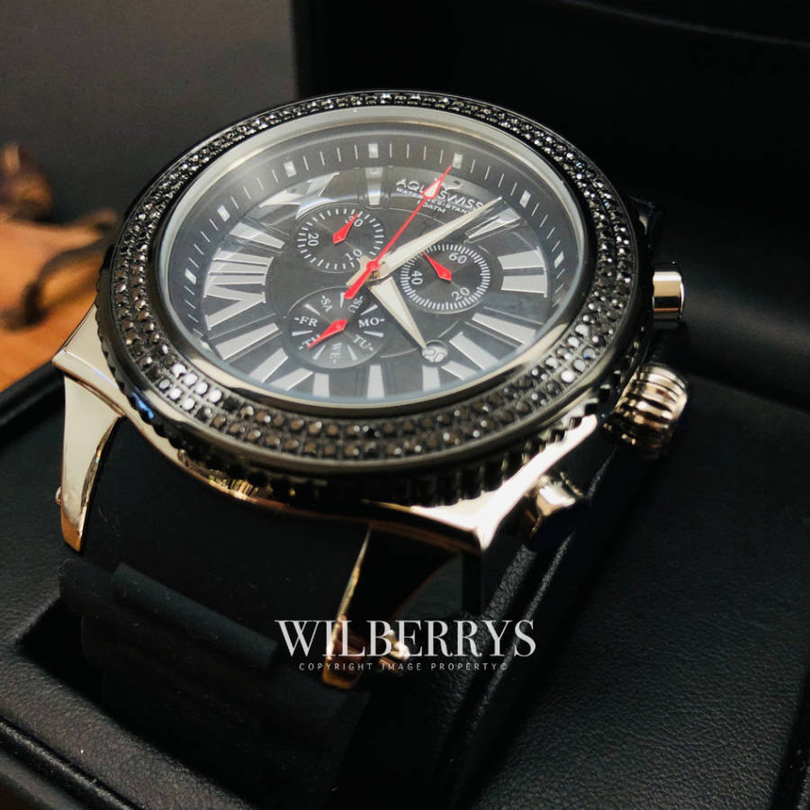 A dignified piece that’ll surely add a depth of shine to your wrist! Centered on a round case, this Aquaswiss showcases textured grooves all along the edge of the unidirectional rotating bezel with sparkling diamond accents along the bezel itself. A silicone strap wraps and secures to your wrist easily with a buckle clasp. With Roman numerals at all even numbered positions and chronographic subdials resting at the center, you’re ready to take on your day!