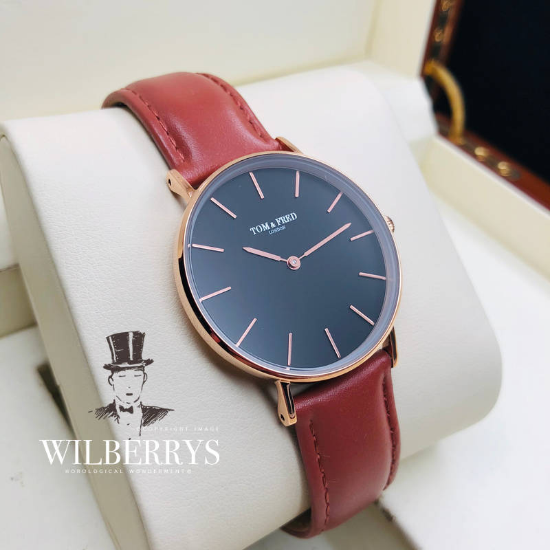 Our iconic classic boasts a midnight black dial paired with hand crafted rose gold index markers. Our metallic, embossed insignia sits at the 12 o'clock position. The British marron brown leather strap, exudes simplicity and class, teamed with our metal engraving on the clasp. Powered by a unique Swiss movement which is housed inside our signature 35mm slim and femininely petit stainless steel casing. Traditional buckle closure. This beautiful timepiece comes packed in a Tom & Fred gift box with a optional 1 year warranty.