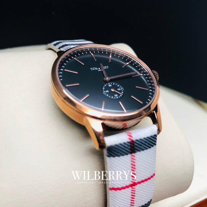 Horological sophistication that showcases a dropped sub dial with hand crafted, silver index markers and detailing. Our traditional, raised metallic TOM & FRED insignia on the dial accentuates our iconic quality. Powered by a unique Swiss movement which is fitted inside a feminine 35mm stainless steel casing. A hand cut Scottish leather and fabric check combination strap adds the finishing touch to definitive versatility. Each and every strap features some variation as each cut of fabric is unique. A traditional buckle secures it to your wrist. This beautiful timepiece comes packed in a luxury Tom & Fred gift box.