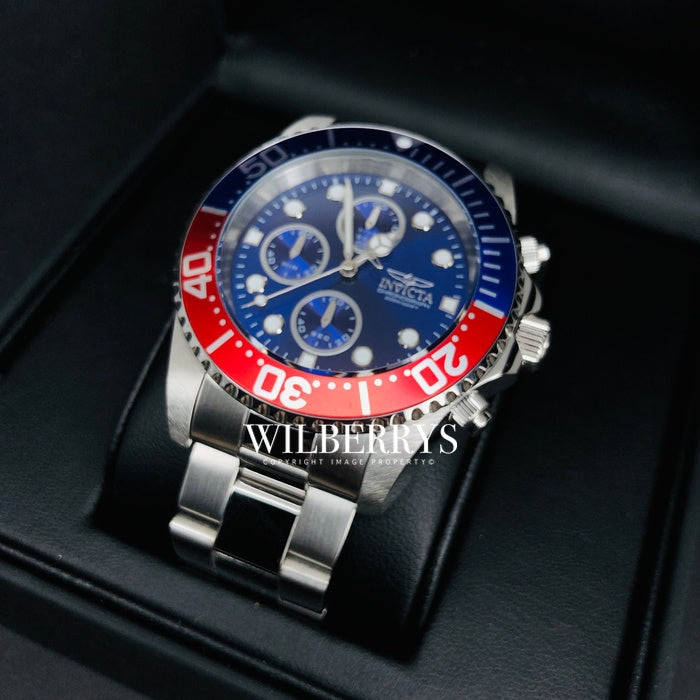 Features a stainless steel 44mm case, with a unidirectional bezel, a blue dial and a flame fusion crystal. Chronograph - sub-dials displaying: 60 second, 30 minute and 1/10 seconds. The 22mm stainless steel band is fitted with a fold over with safety release clasp. This beautiful wristwatch, powered by a SII Caliber VD55B, quartz movement, supporting: chronograph, hour, minute, second functions. This watch has a water resistance of up to 660 feet/200 meters.