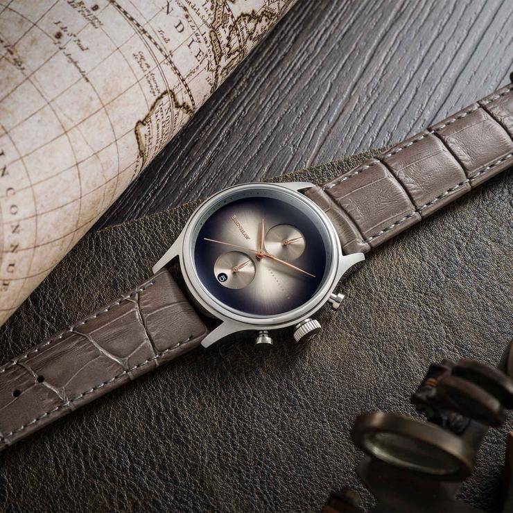 The smoky mystery of the Fumée dial comes alive with this elegant timepiece. With a subdued, minimalistic dial, the watch is a sophisticated expression of the Earnshaw brand. A 43mm fluidly round case with polished bezel frames the dial face with cleanly cut leaf shaped hour and minute hands adding perfect balance and weight. Piston like pushers operate the chronograph without adding too much weight or heft to the case to retain a more graceful feel. A genuine leather strap that attaches to the case combines perfectly to complete a symphony of detail and finishing on this subtly remarkable timepiece.