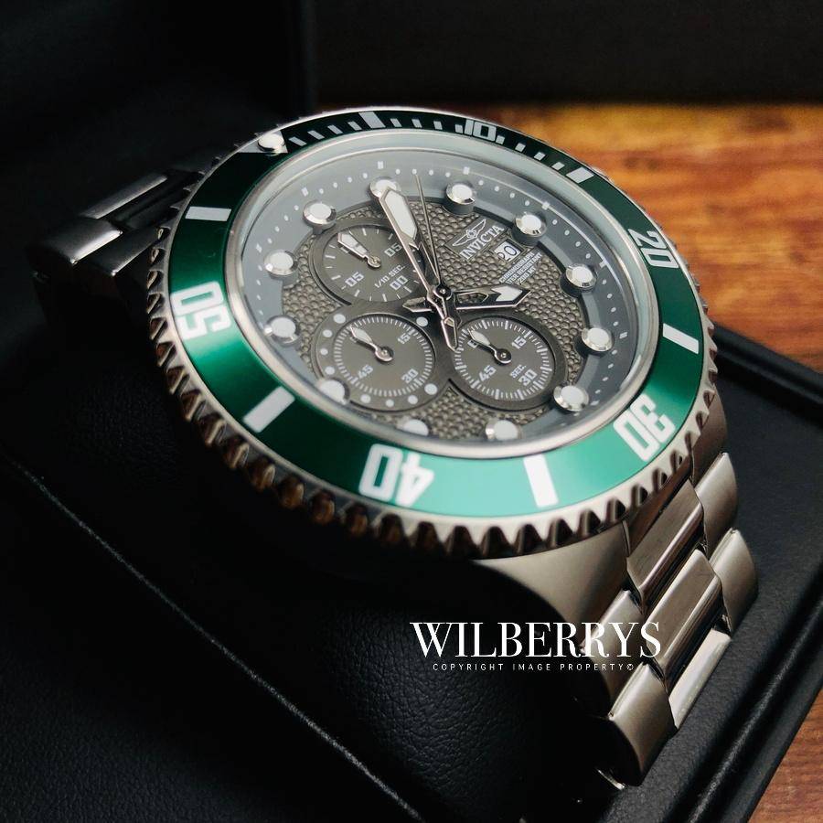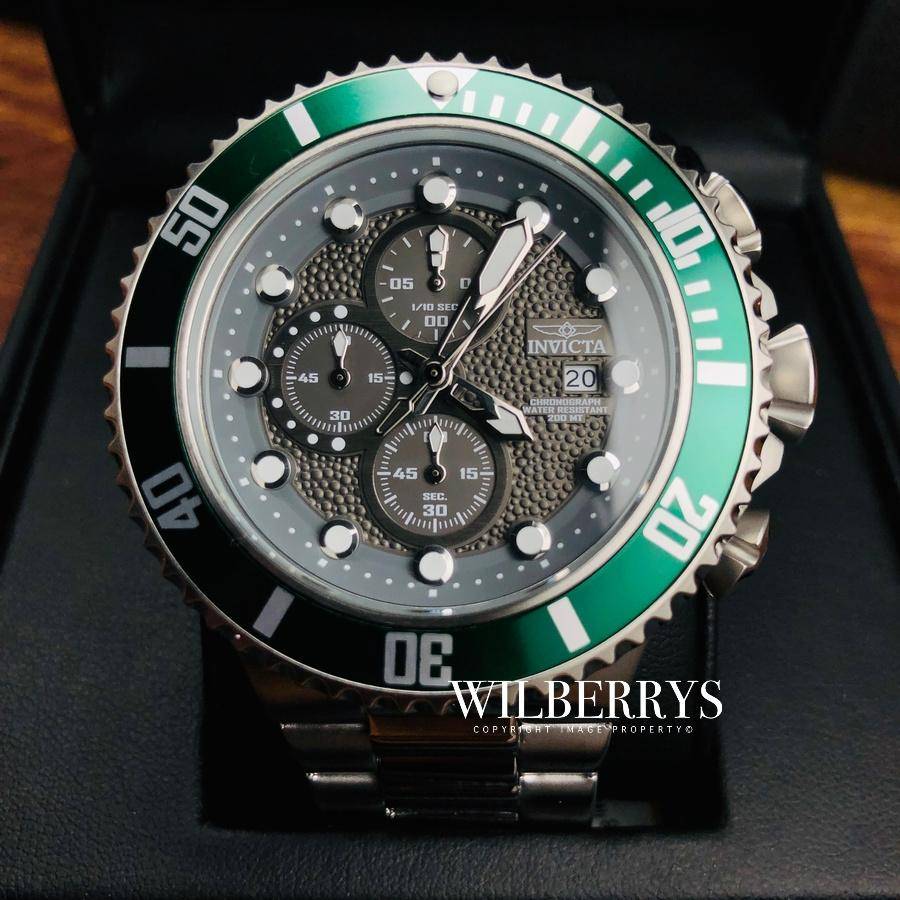 Stainless steel 50mm case, with a uni-directional rotating stainless steel with green bezel, a gunmetal dial and a scratch resistant mineral crystal.