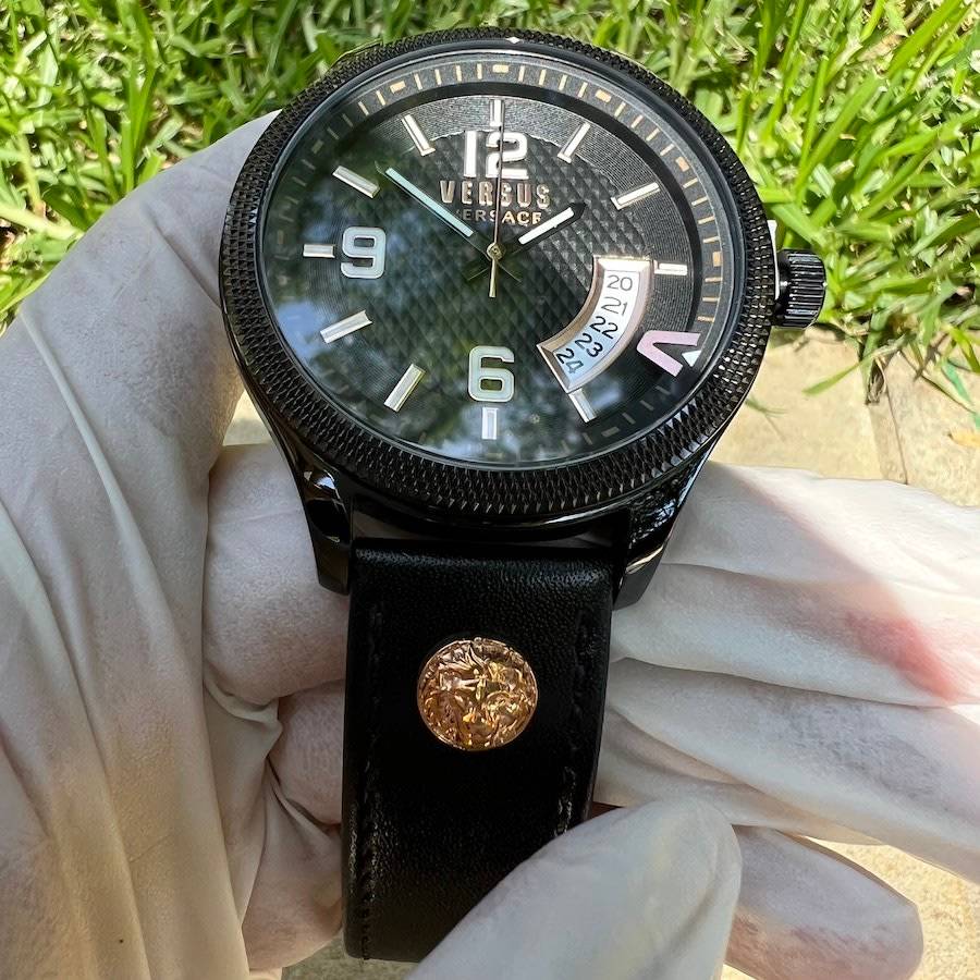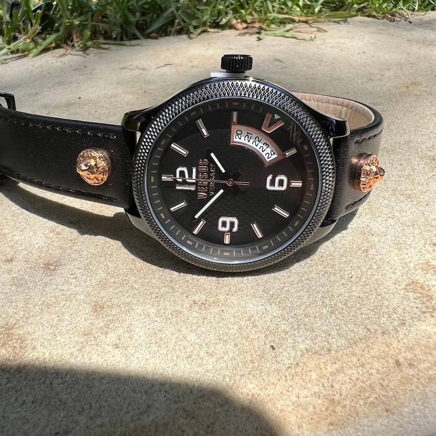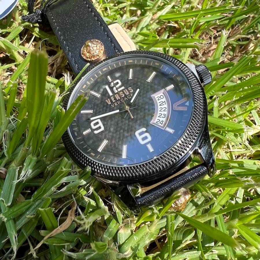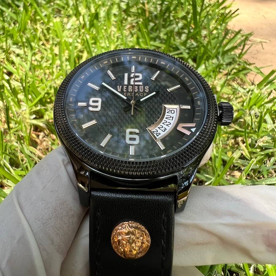 The geometrical dial features a big date window at 4 o'clock together with a bold "V". Enriched with Versus Versace 3D lion head at 12 and 6.
