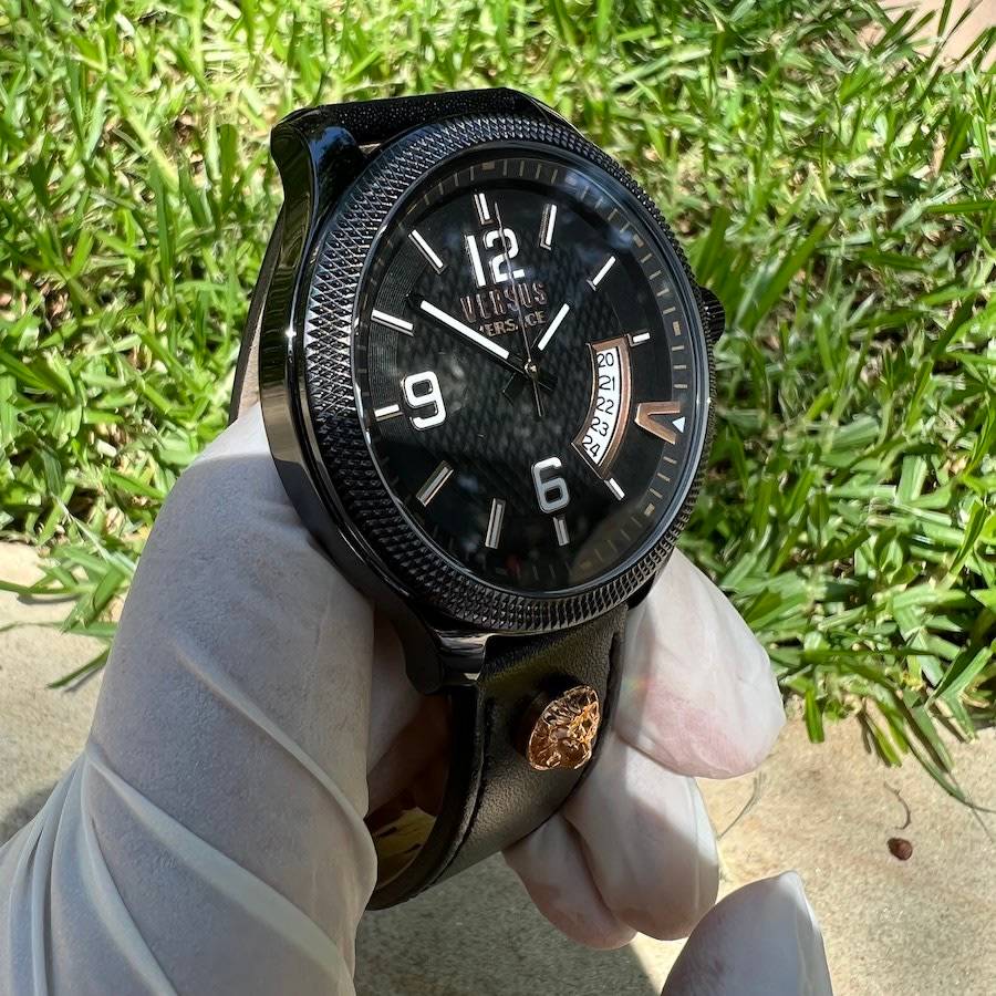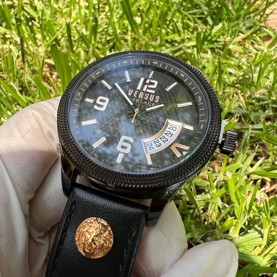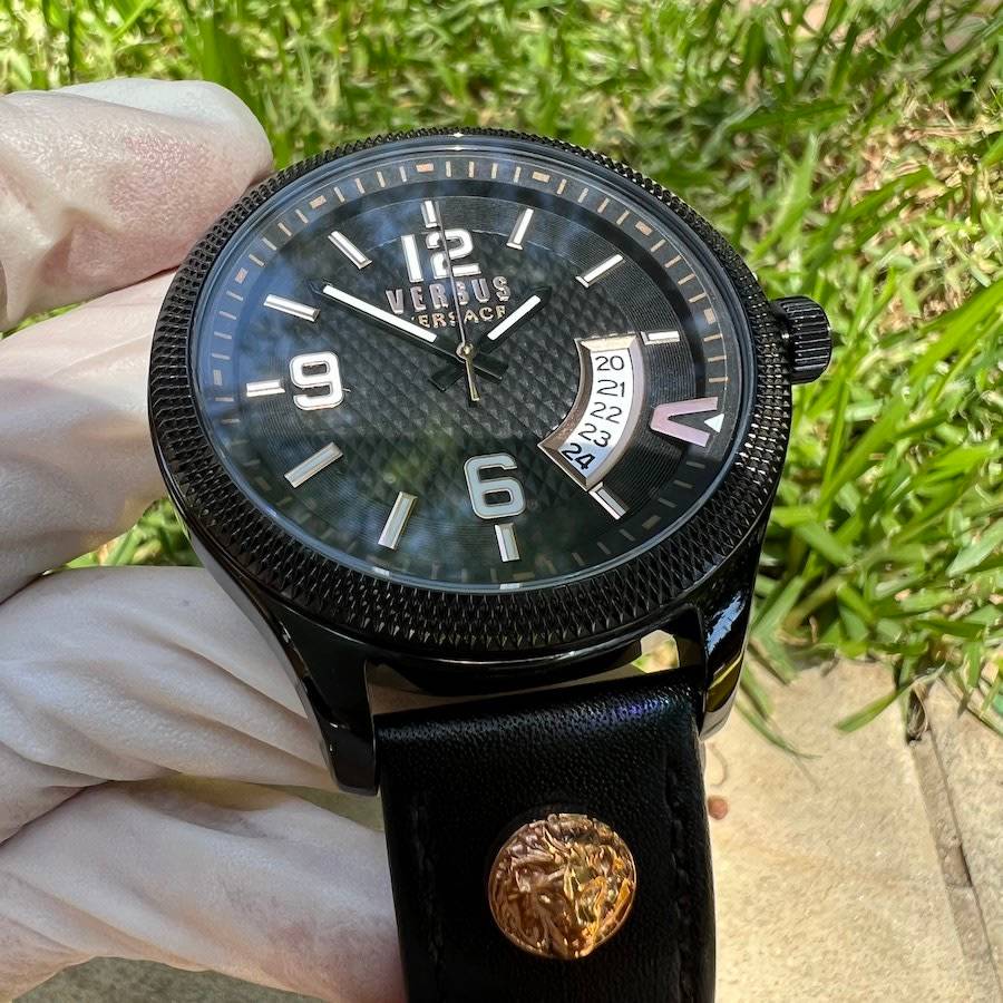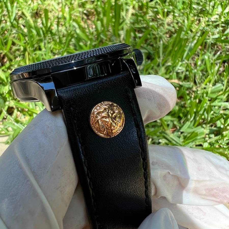 The geometrical dial features a big date window at 4 o'clock together with a bold "V". Enriched with Versus Versace 3D lion head at 12 and 6.