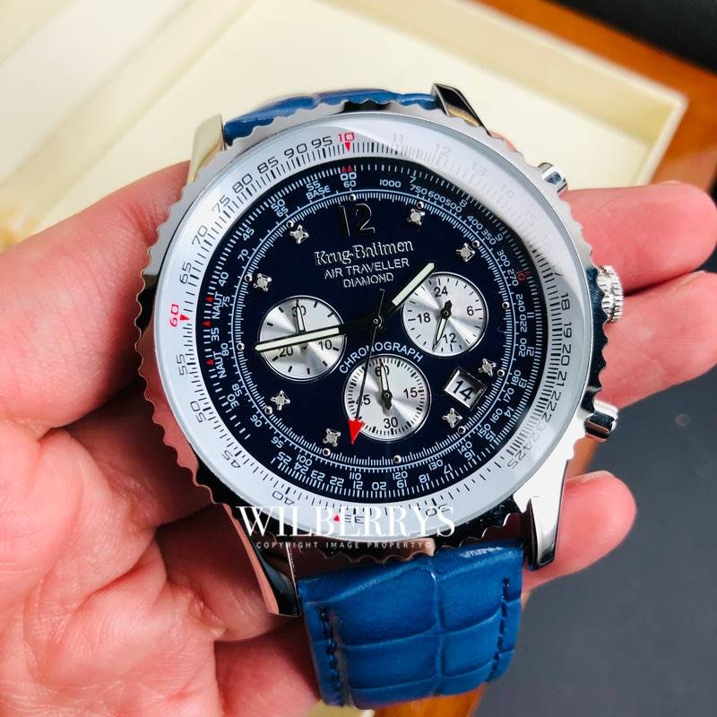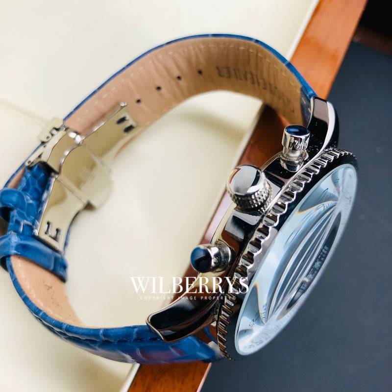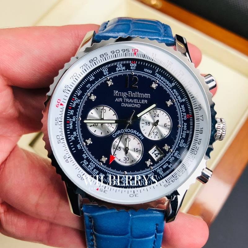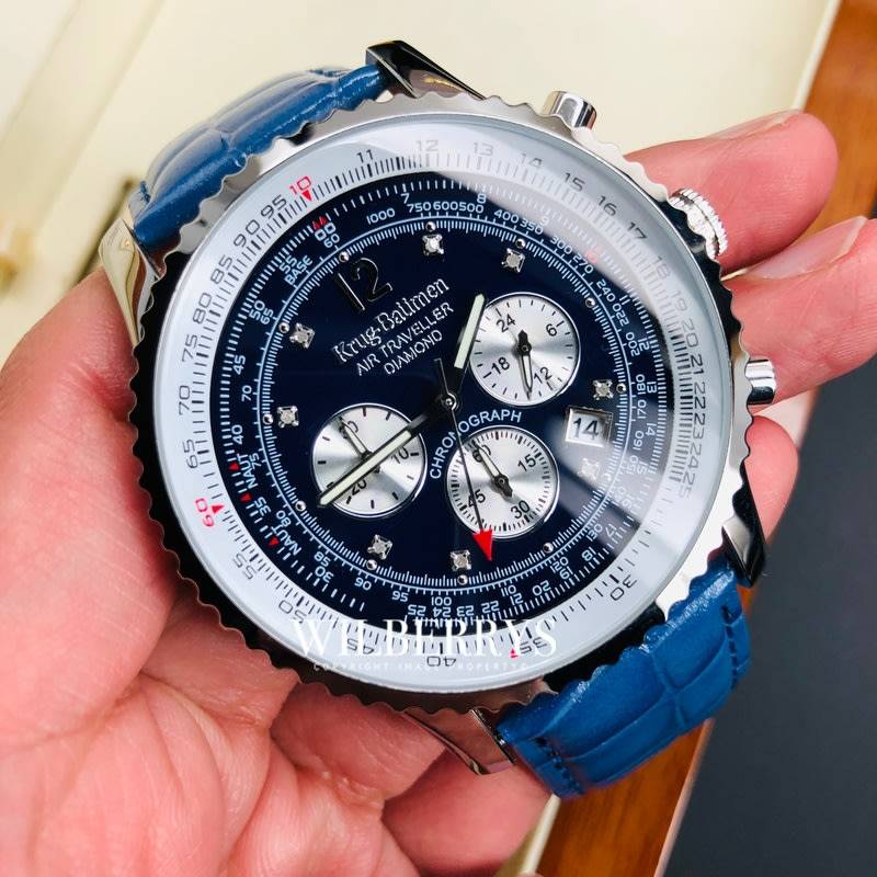 Gentlemen's Sports Split Time Chronograph with Tachymeter function and Slide Rule. Pilots can use the slide rule to get estimates of important information such as flight time and fuel consumption. Features 8 single cut diamonds & 3 eye chronograph display. The stainless steel head is finished with polished Silver for a stunning look. Genuine leather strap with personalised buckle. Every Air Traveller is carefully engraved with it's own unique serial number and presented in it's own display case. A diamond authenticity certificate is provided for complete peace of mind. Case diameter 46mm. Water resistance 30m/suitable for light splashes only (avoid all water).