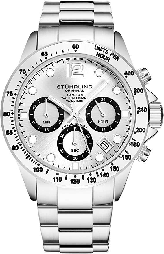 An ultra-precise quartz movement powers the full function chronograph. Rated 10 ATM Water Resistant (100 meters/330 feet) and featuring a fluted screw down crown, this stays on pace whether it’s rain or shine.