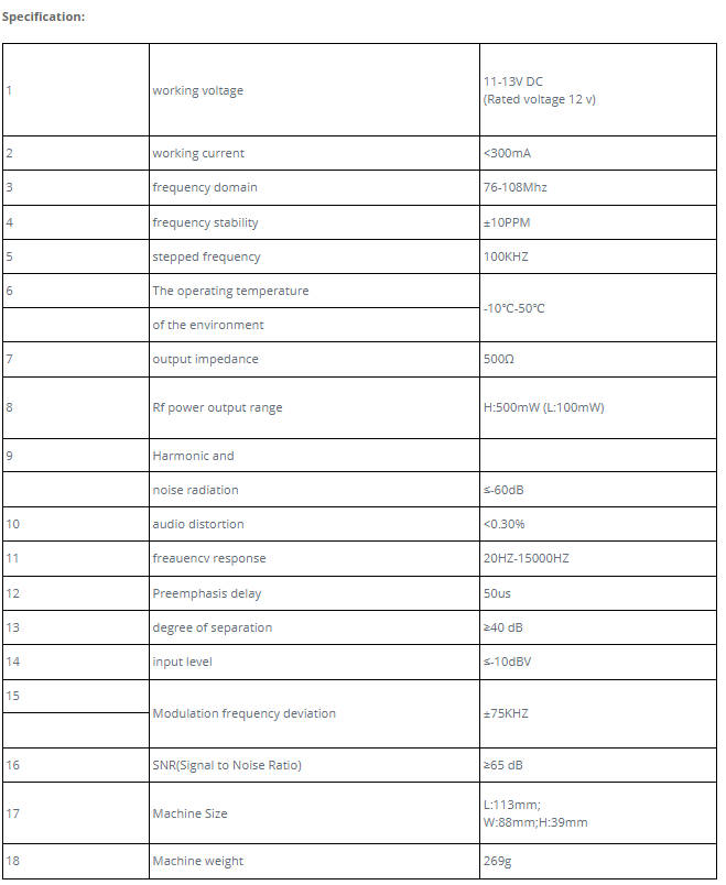Built in micro controller for frequency control and display. Built in FM stereo transmitter IC with PLL technology, surface-mount tech, reliable working condition. The transmission frequency is highly stable, compact design with aluminum enclosure.