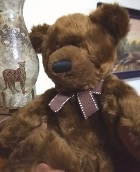 Russ Berrie Item no 23136 - Larz! Classic looking Bear. Gorgeous, dark, chocolate brown, plush fur. Velvety paw pads and beans in tummy to sit up strait. Black stitched nose and beaded eyes. Retired and hard to find. A sheer brown neck bow completes his look. Measures 35cm long and 28cm in sitting position. An absolutely beautiful Teddy Bear. Larz is surface washable and soft and cuddly with a tush tag only. Colour differs due to flash photography. A beautiful bear and a beautiful addition to the Russ Berrie collector!