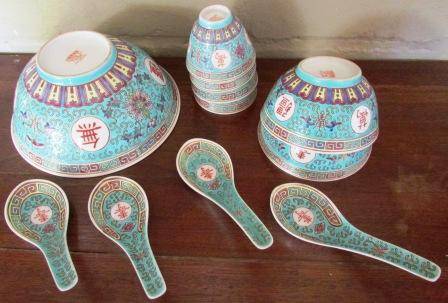 Retro Chinese Eating Set. 1x Large Bowl ( 18 x 8 cm H), 2x Medium Bowls, 4x Small Bowls, 4x Spoons