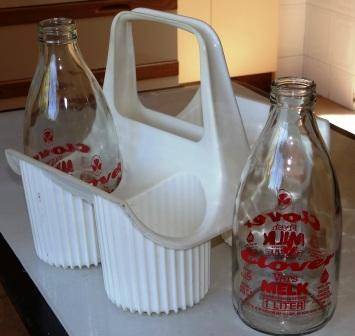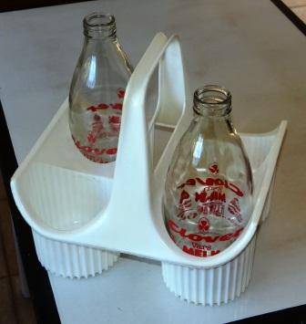 Retro "Clover" 1 litre milk bottles x 2 in carrier