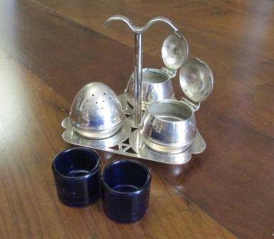 Retro Cruet Set on EPNS stand. Pepper (salt and mustard pots have blue liners). App. 10cms high