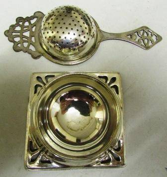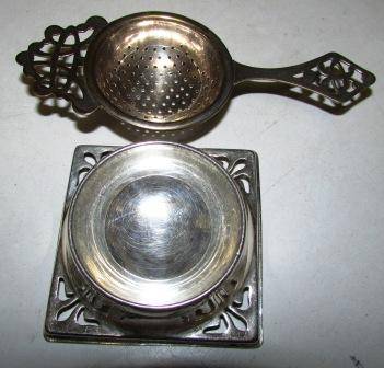 Retro EPNS tea strainer & stand .(N.B. age appropriate loss of EPNS)