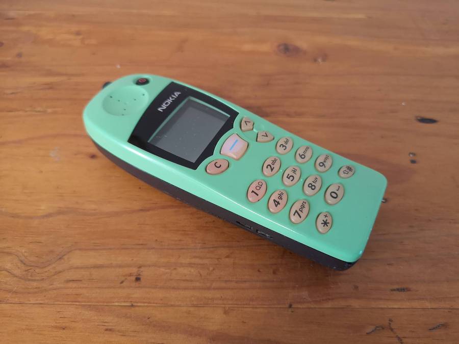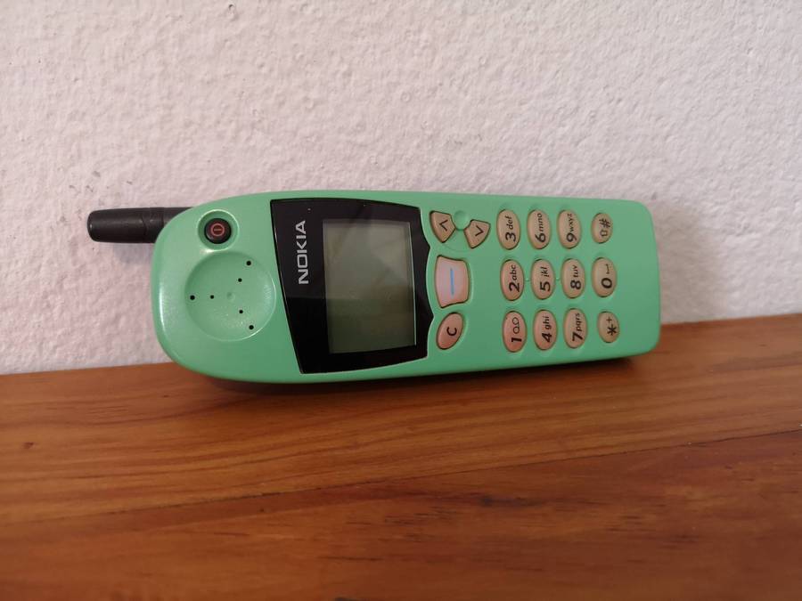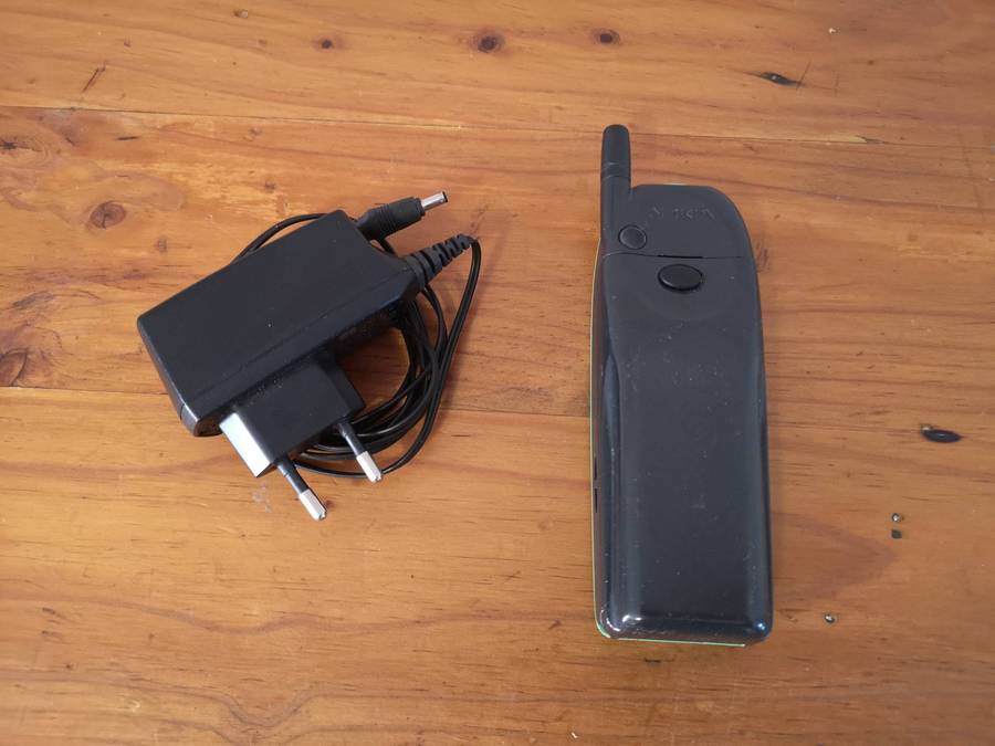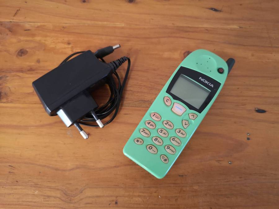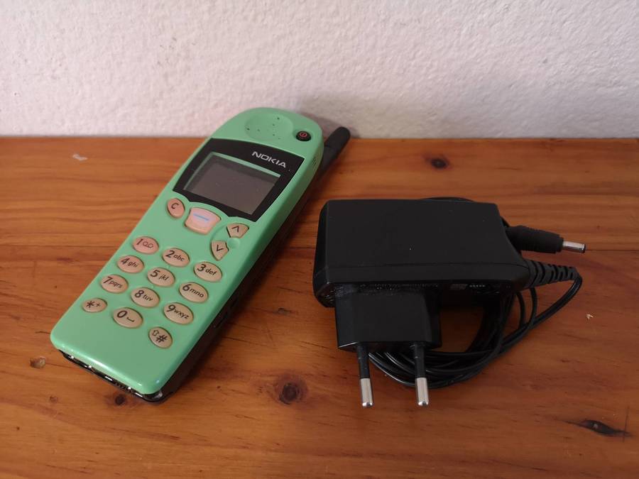 Retro Nokia 5110 with original green cover and charger. The phone isn't charging though, my guess is that the battery is dead.
