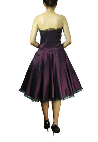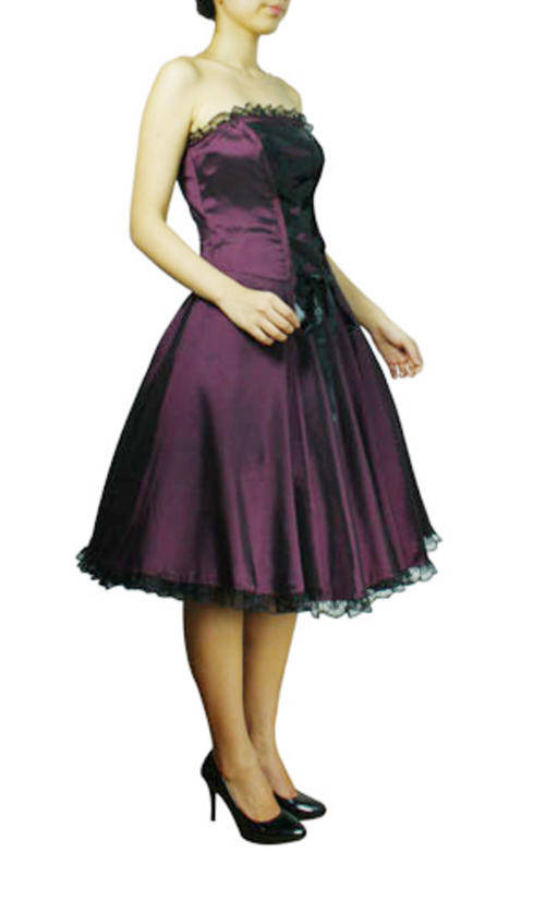 This beautiful dress has thick satin corseting ribbon down the front of the bodice that ties into a sweet little bow, the top of the bodice and the bottom hemline are accented with black lace, with a side zip. The petticoat is not included.