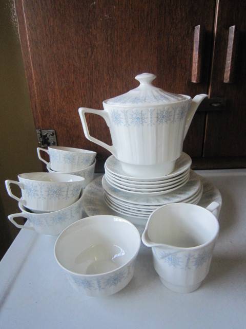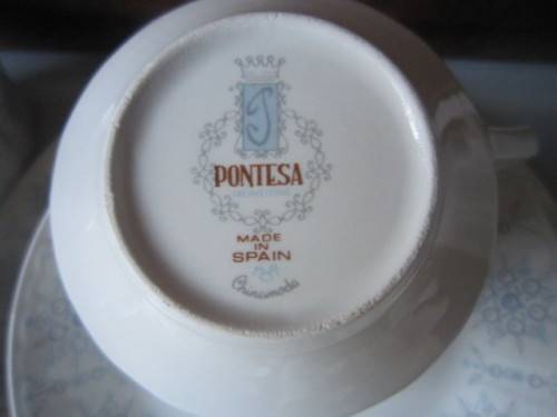 Really beautiful Pontesa tea set, very Retro in design and shape, but with stunning muted colours depicting snowflake designs. Tea set consists of:- 1 teapot with lid, 4 cups, 5 saucers, 6 side plates, a milk jug, a sugar bowl and a lovely cake plate. There is some age crazing but it is not to hectic and is not discoloured. The design and colours of this set are really beautiful. Tea pot 17cms high and 24cms long, the other units are also a decent size. Postage would be 120.00 due to number of units in the set.