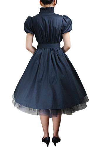 This dress is made of cotton/spandex blend fabric, little puff sleeves, ruffled in the neckline and the bottom, some buttons in the front, with an adjustable belt in the waist. The petticoat is not included.