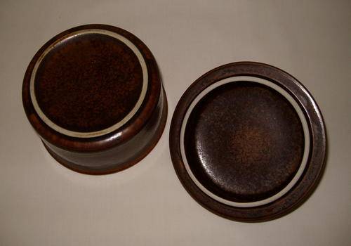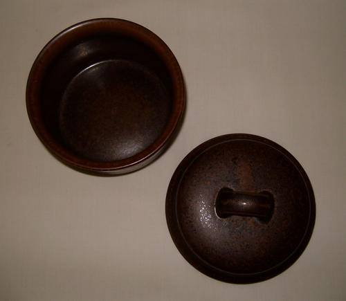 A rustic, mottled brown glazed stoneware sugar pot and cover designed by Ulla Procopé in 1960.