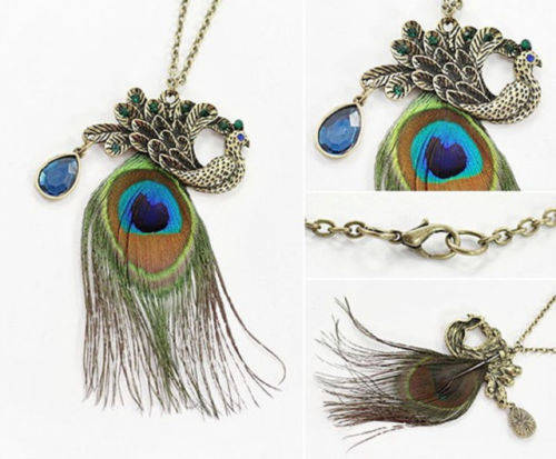 Retro Vintage Bronze Peacock Feather Long Chain Necklace