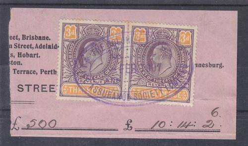 REVENUE ++ KE VII ++ 1903 ++ 3d x 2 LILAC & ORANGE ++ FU ON PIECE - SEE BELOW ++ BT 146