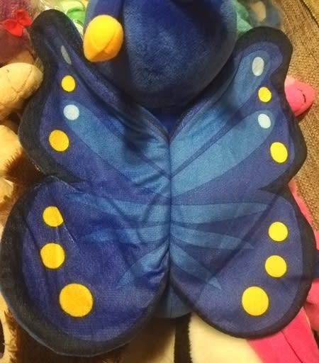 Have loads of fun with this reversable, 2 in 1 caterpillar toy. Blue, cream and green, velvety short fur. Blue caterpillar have big wings with yellow spots. Length across is 30cm. Colorful, sewn facial features. Toy in very good condition, looking for loads of hugs!