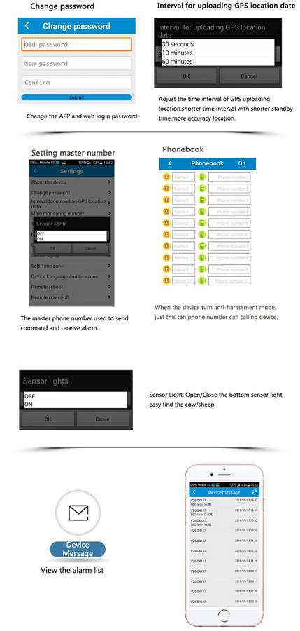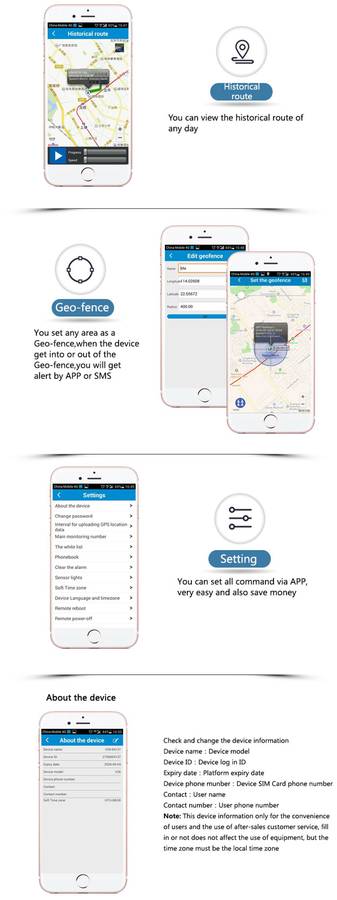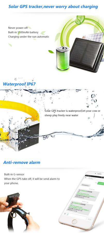 GSM four frequency bands + GPS tracking. Solar power charge automatically. (Power on under the sunlight itself.) Waterproof IP66. SOS alarm & two-way calls. Anti-remove alarm. WIFI locating & WIFI anti-lost fence. Track with Web platform/ APP/ WeChat/ SMS commands. Historical route display/ Geo-fence. Voice monitoring. Low battery alarm. SIM card changing alarm. Timing switch.