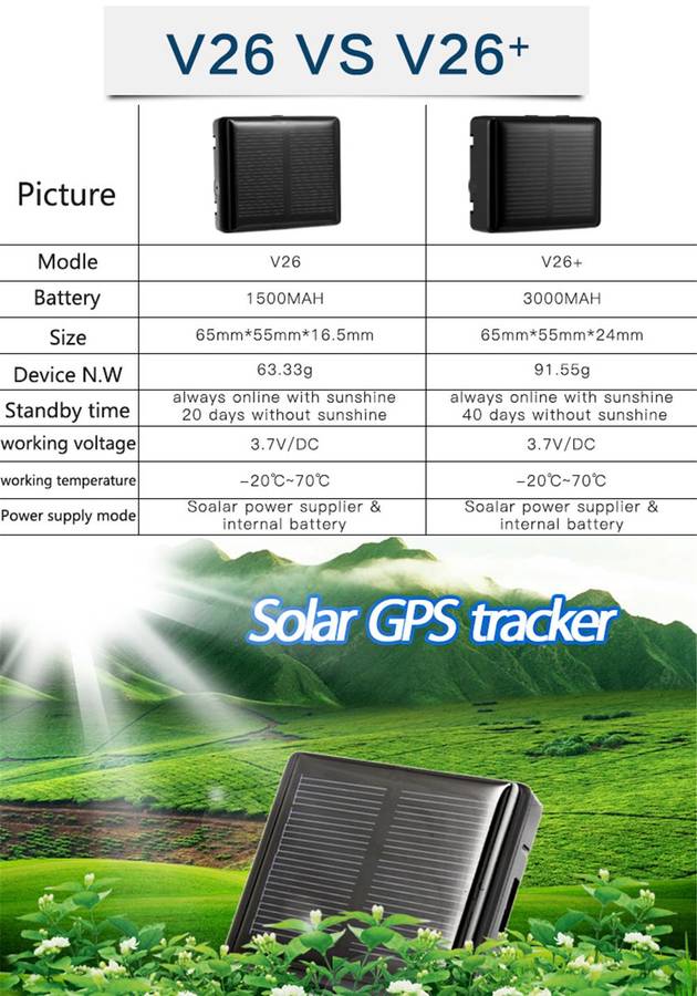GSM: 850/900/1800/1900MHz GPRS Standard: Class 12, TCP/IP GPS locating time: 30sec with cold boot (open sky), 29sec with warm boot (open sky), 5sec with hot boot (open sky) GPS positioning accuracy: 10-15m (open sky) WIFI positioning accuracy: 15-100m (accuracy depends on google map database) LBS positioning accuracy: 100-1000m Working temperature: -20 to +45 (solar charging will be affected when it is more than 45) Working humidity: 5%-95% RH Device dimension: 65 (length) x50 (width) x24 (height) mm Device host net weight: 92g Battery capacity: 3000 mAh (Long standby Version)