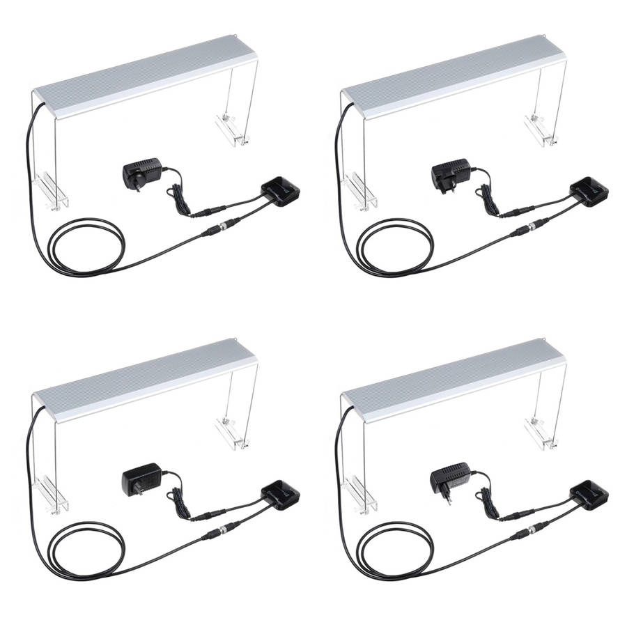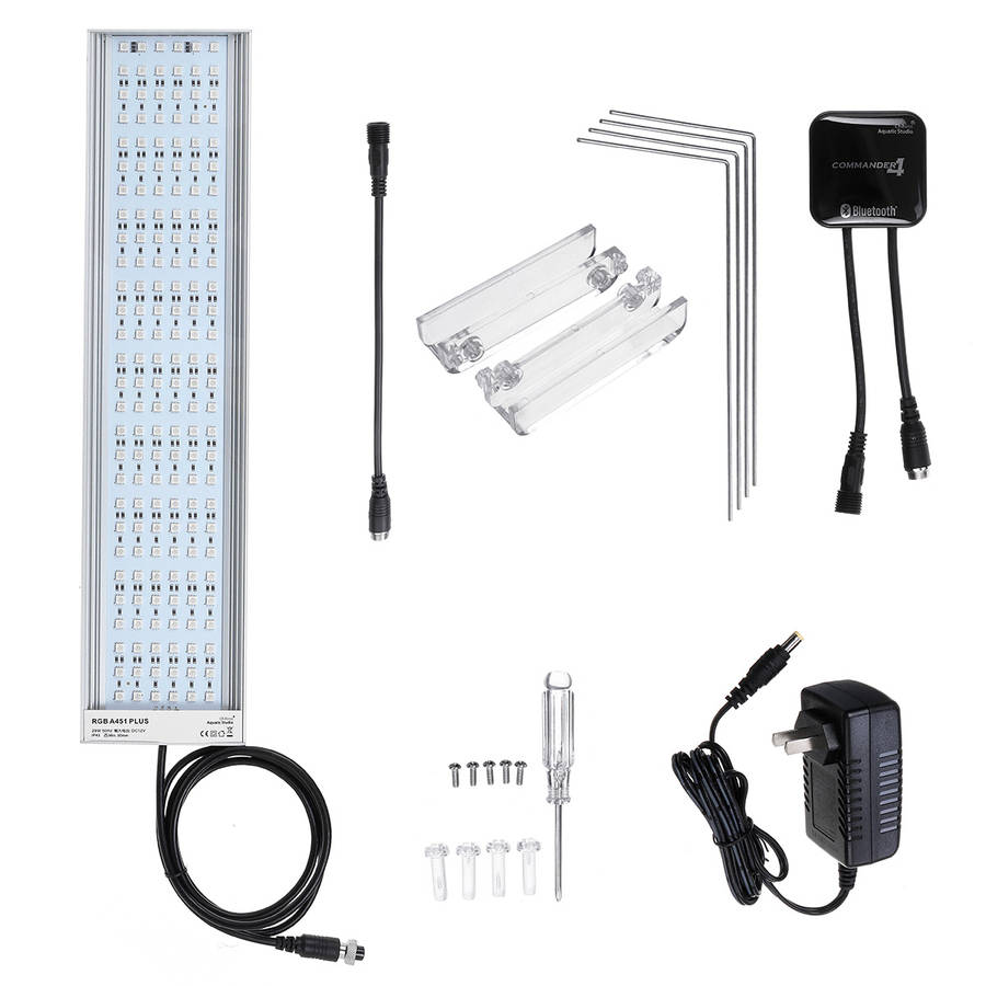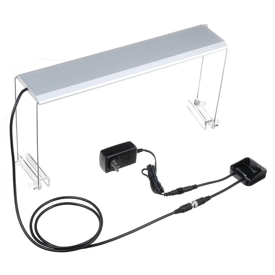 Fish Tank Lamp: Features: - Length & Height scalable stainless stand. - Six rows of RGB three-in-one lamp beads can meet power requirements perfectly. - Support brightness adjustment. - Bluetooth connection controller, APP dimming, timing.- Two modes: Manual (Fixed light does not change); Auto (displays the set program light according to the passage of time). - LED cover made of aluminum alloy and finished with anodize surface treatment, effectively reduce the heat generation problem of high luminosity LED lamps and prevent from rust.