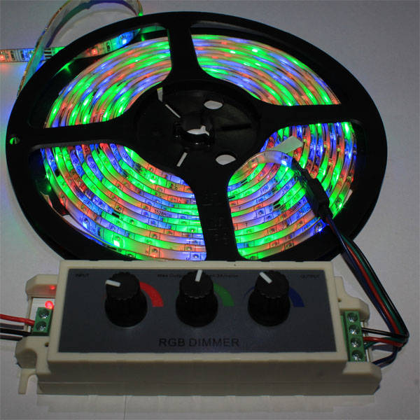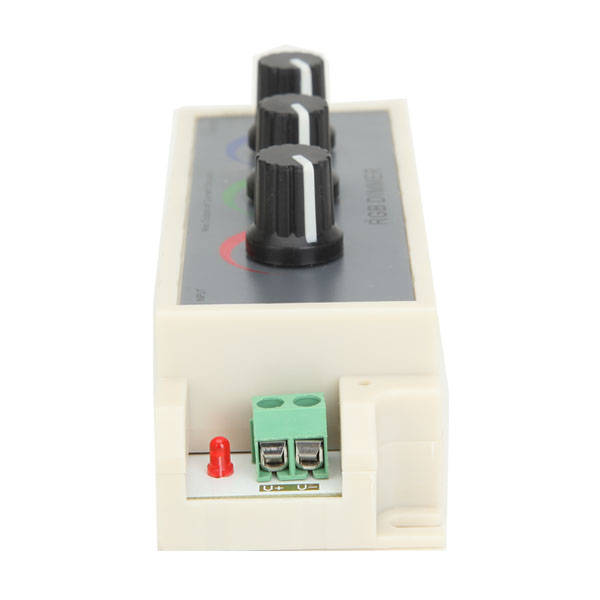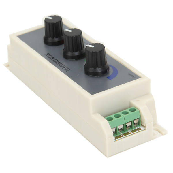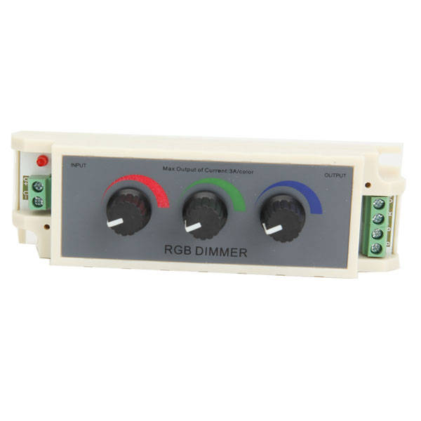 Video show: Description: RGB Dimmer is a new led strip dimmer controller that can adjust brightness of color (for instance red, green and blue) infinitely. Its control mode is knob-operated control, you could adjust light to the approriate lighting color in accordance with your actual need. It will make your life more colorful. Name of Product: RGB Dimmer Stepless Adjustable Switch Input Voltage: DC12-24V Wattage: 12v<108W, 24v<216W Output: 3 channels Connection Mode: common anode External dimension: L130 Χ W40 Χ H52 mm Static Oower Consumption: < 1W Output current: 3A each channel Working temperature: -20-60 ¿¿¿