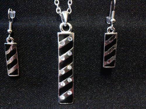 Color: Clear, Black & Silver Material: Silver toned alloy Pendant Dimensions: 8.5 x 40.2 mm Chain Dimensions: 550 x 2.8 mm Earring Dimensions: 7 x 20 mm